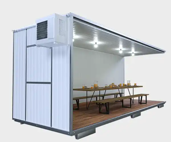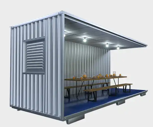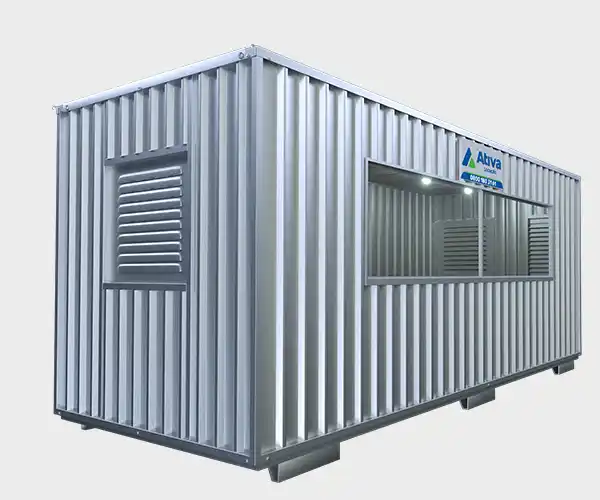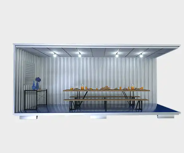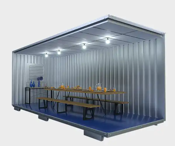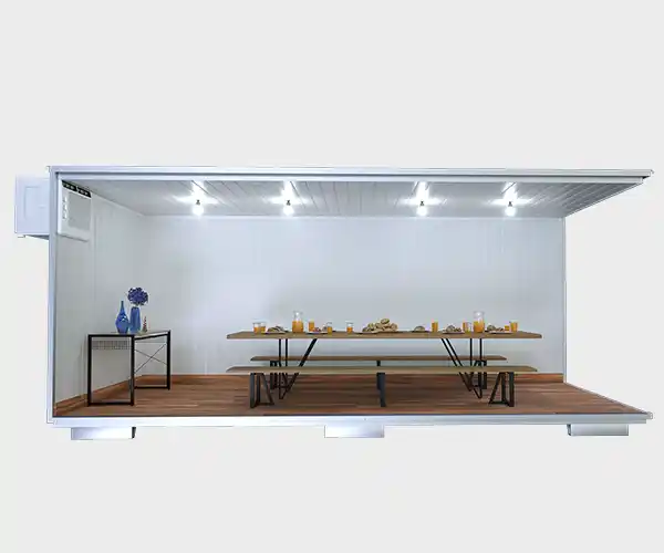 A capacidade máxima depende do layout interno e do uso específico. Em um arranjo típico de refeitório, o Container pode acomodar confortavelmente até 6 pessoas simultaneamente.